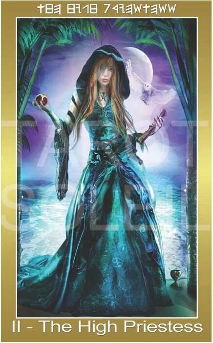 The High Priestess: The High Priestess rising up from the Sea, the High Priestess is the gatekeeper of spiritual knowledge. The palm trees surrounding her represent the door to the unconscious world from which she floats. She is the keeper of the secrets and mysteries of all life. The High Priestess represents the collective unconscious and the feminine divine power within all women as symbolized by the moon. A mystic and a mother to the universe, she is not grounded in the material realm and must rely only upon her own intuition. She wears a necklace with the symbol of Pisces and a hooded robe symbolizing her association with a secret society. The owl flying above represents her wisdom and ability for divination. The