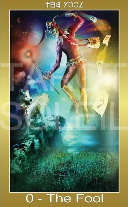 step is nor does he care; he sees it as an endless path of joy and happiness. He starts off this journey at the most spiritual point on the island with the belief that this door will open many more. With him is his white dog. White represents the element of air that gives him the objectivity he needs for this journey, because without it, he lacks direction. His dog helps him remember and stay connected to his inner creativity and focused intuition; because sometimes his own passions cloud his judgement and this could be his downfall if not careful. His wand with the orb of Uranus is his guiding light, and shows him the way. He is carefree, tossing cards of the Phoenician alphabet behind him, which pays homage to their cultural history on this island. He leaves their story behind him, with the intention to continue their quest into deeper spiritual knowledge. This journey is easy for him, as he cares not for the material world, and has no fear.